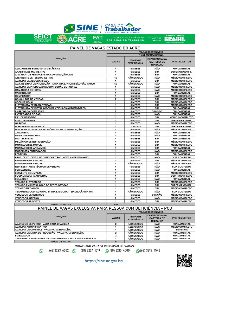 O Sistema Nacional de Emprego (Sine) do Acre divulgou, nesta quinta-feira, 16, um novo painel com 119 vagas de trabalho disponíveis para diferentes áreas profissionais em Rio Branco.