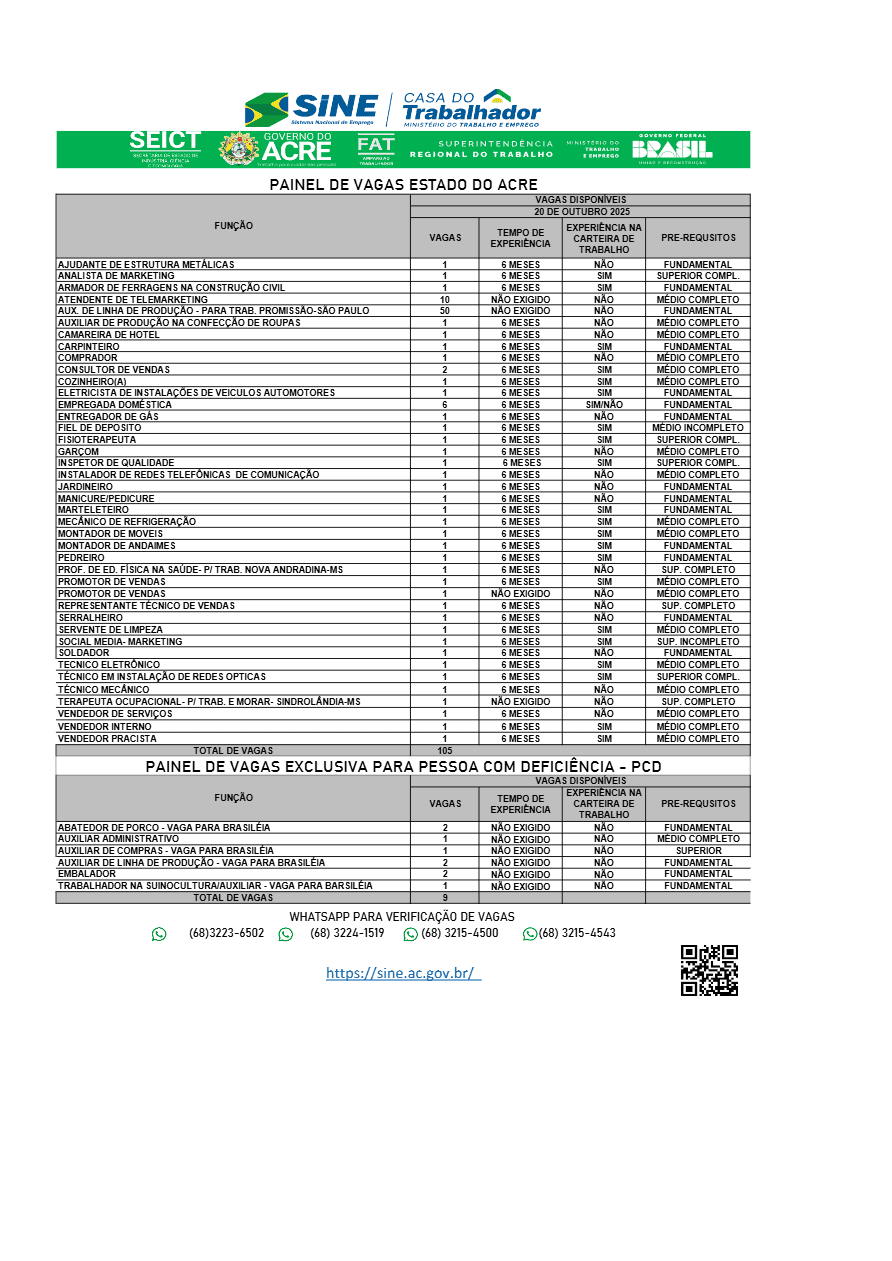O Sistema Nacional de Emprego (Sine) do Acre abriu a semana divulgando, nesta segunda-feira (20), um novo painel com 114 vagas de trabalho disponíveis para diferentes áreas profissionais em Rio Branco.