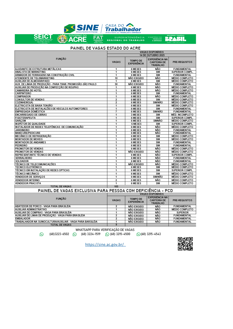 O Sistema Nacional de Emprego (Sine) do Acre iniciou a semana com um novo painel de oportunidades, oferecendo 114 vagas de trabalho nesta terça-feira (14) para diferentes áreas profissionais em Rio Branco.