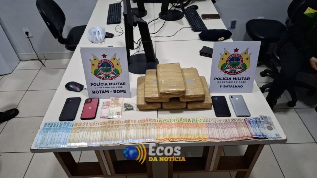 Policiais da Força Tática do 1º Batalhão e da ROTAM Alpha 04, que atuam na Operação RENOE, apreenderam uma mala com seis barras de maconha e prende três homens durante abordagem na noite desta quarta-feira, 19, na Travessa Juricaba, no bairro João Paulo II, em Rio Branco. Os detidos foram identificados como Wesley Avelino Albuquerque, 25 anos, Benedito Taylon Araújo Colombo, 35 anos, e Henrique Cosme da Silva, 25 anos.