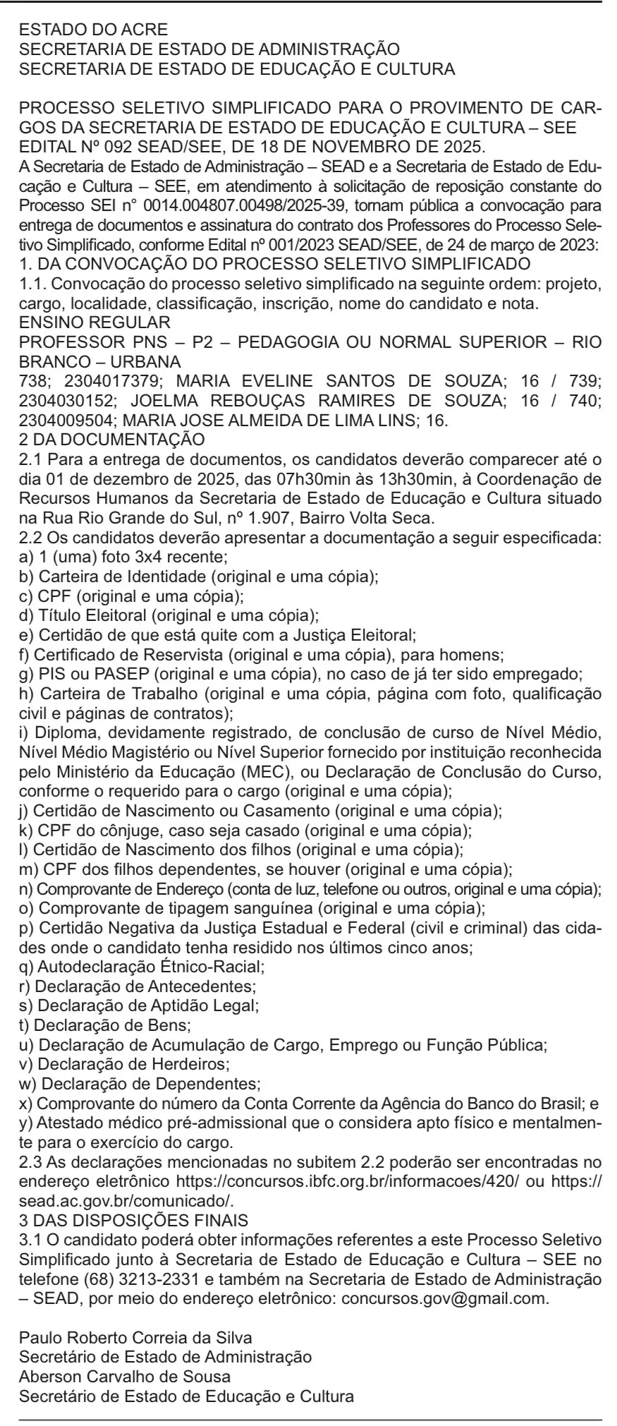 Foram chamados os professores Maria Eveline Santos de Souza, Joelma Rebouças Ramires de Souza e Maria José Almeida de Lima Lins, todos classificados para o cargo de Professor PNS – P2 (Pedagogia ou Normal Superior) na zona urbana de Rio Branco.