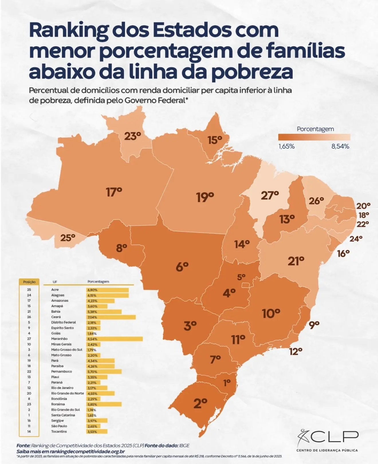 O Acre ocupa a 25ª posição no Ranking de Competitividade dos Estados 2025, elaborado pelo Centro de Liderança Pública (CLP), no indicador que mede a proporção de famílias vivendo abaixo da linha da pobreza. Segundo os dados, 6,80% dos domicílios acreanos têm renda per capita inferior ao valor definido pelo Governo Federal.