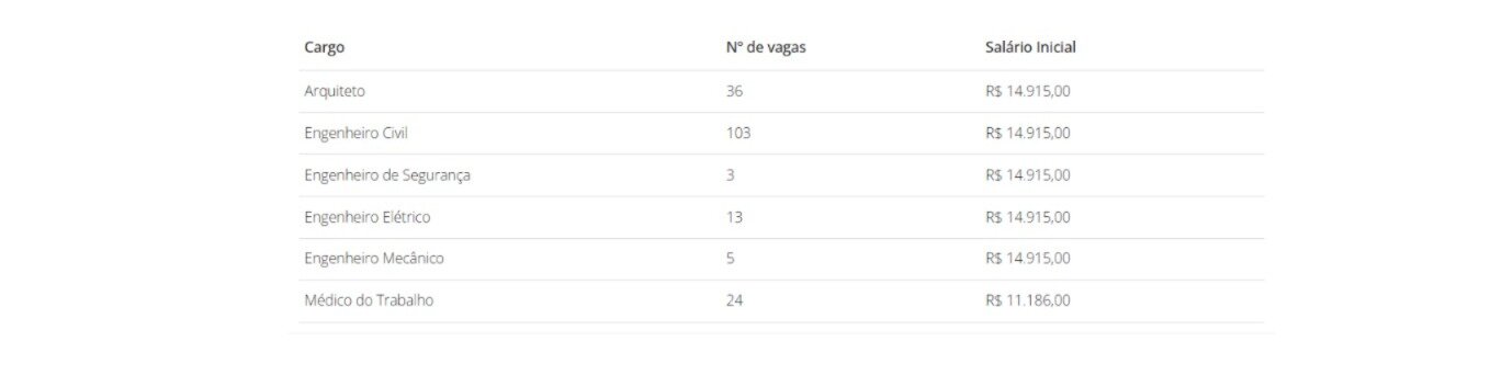 Ao todo, serão 184 vagas distribuídas entre seis cargos. A maior parte é para engenheiros civis, mas também há oportunidades para arquitetos e médicos do trabalho. Os salários variam de R$ 11.186,00 a R$ 14.915,00.