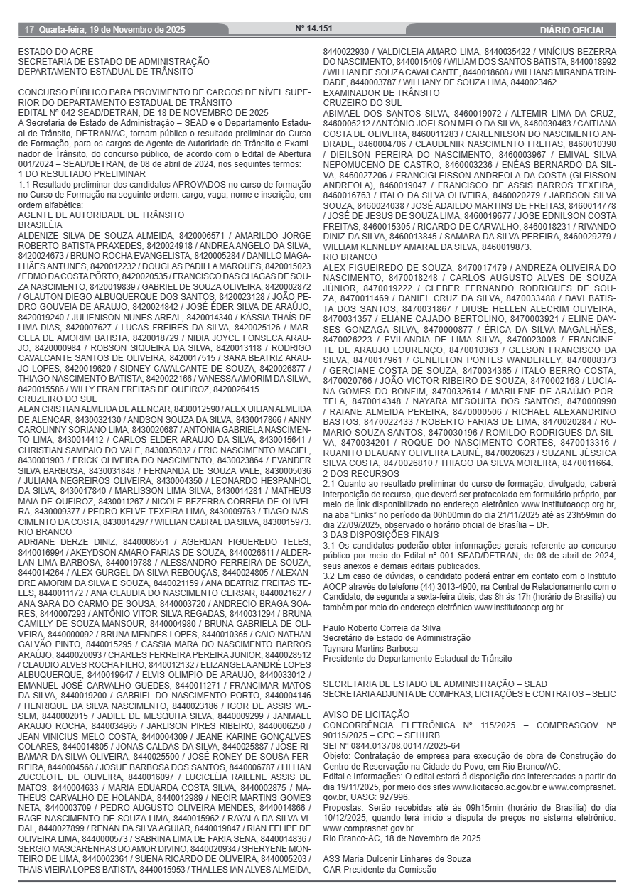 O Governo do Acre, por meio da Secretaria de Estado de Administração (Sead) e do Departamento Estadual de Trânsito (Detran/AC), publicou nesta quarta-feira, 19, o resultado preliminar do curso de formação para os cargos de agente de autoridade de trânsito e examinador de trânsito, etapas finais do concurso público regido pelo Edital nº 001/2024.