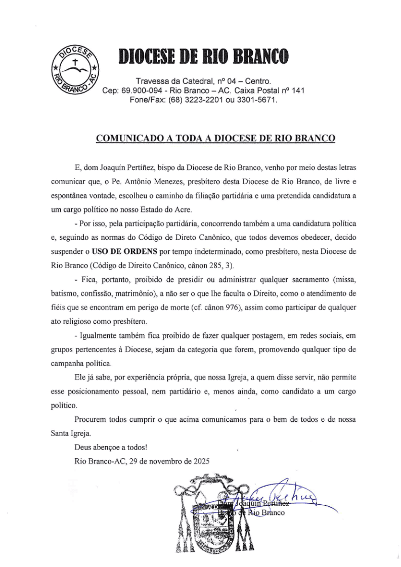 A Diocese de Rio Branco afastou, neste sábado (29), o padre Antônio Menezes de todas as funções sacerdotais após o religioso se filiar ao Partido dos Trabalhadores (PT) e anunciar pré-candidatura a deputado estadual. O comunicado foi assinado pelo bispo dom Joaquín Pertíñez, que classificou a postura do sacerdote como incompatível com as normas da Igreja Católica.