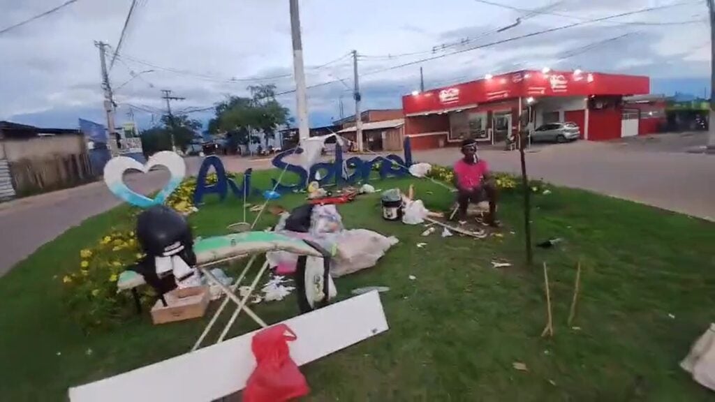 No vídeo registrado pelo ativista, é possível ver diversos objetos acumulados na rotatória, como tábua de passar, peças de ventilador, papelões, plásticos e outros materiais espalhados pelo espaço.