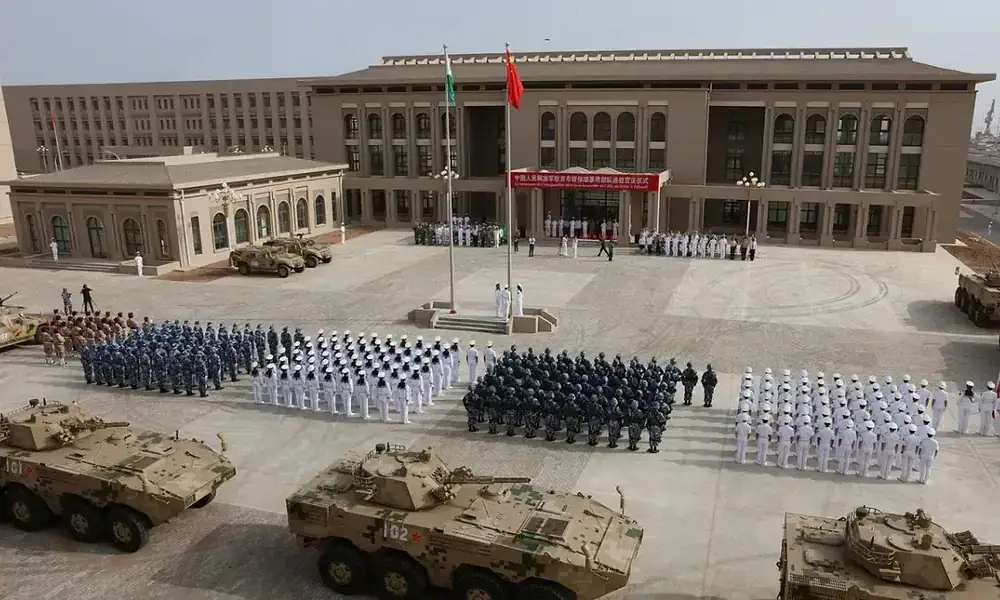 Esta foto tirada em 1º de agosto de 2017 mostra o pessoal do Exército de Libertação do Povo Chinês participando da cerimônia de inauguração da nova base militar da China em Djibuti • Stringer/AFP/Getty Images