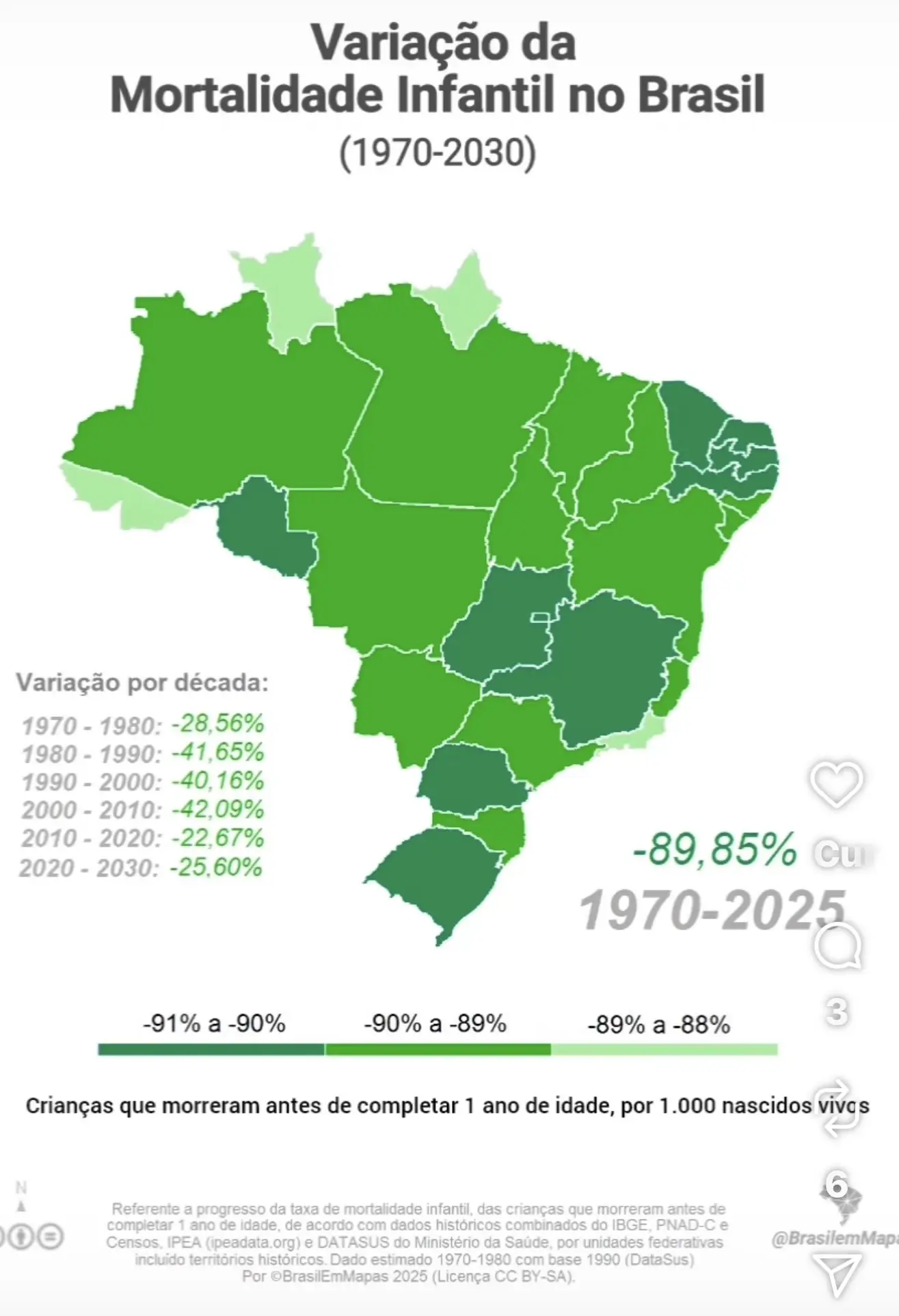 O Brasil encerra 2025 com uma das maiores reduções históricas na taxa de mortalidade infantil. Entre 1970 e 2025, o país registrou uma queda de 89,9% no número de mortes de crianças menores de 1 ano por mil nascidos vivos — passando de 119,3 para 12,1 óbitos. O Acre acompanhou essa trajetória, mas aparece entre as unidades da federação com menor ritmo de progresso no período.