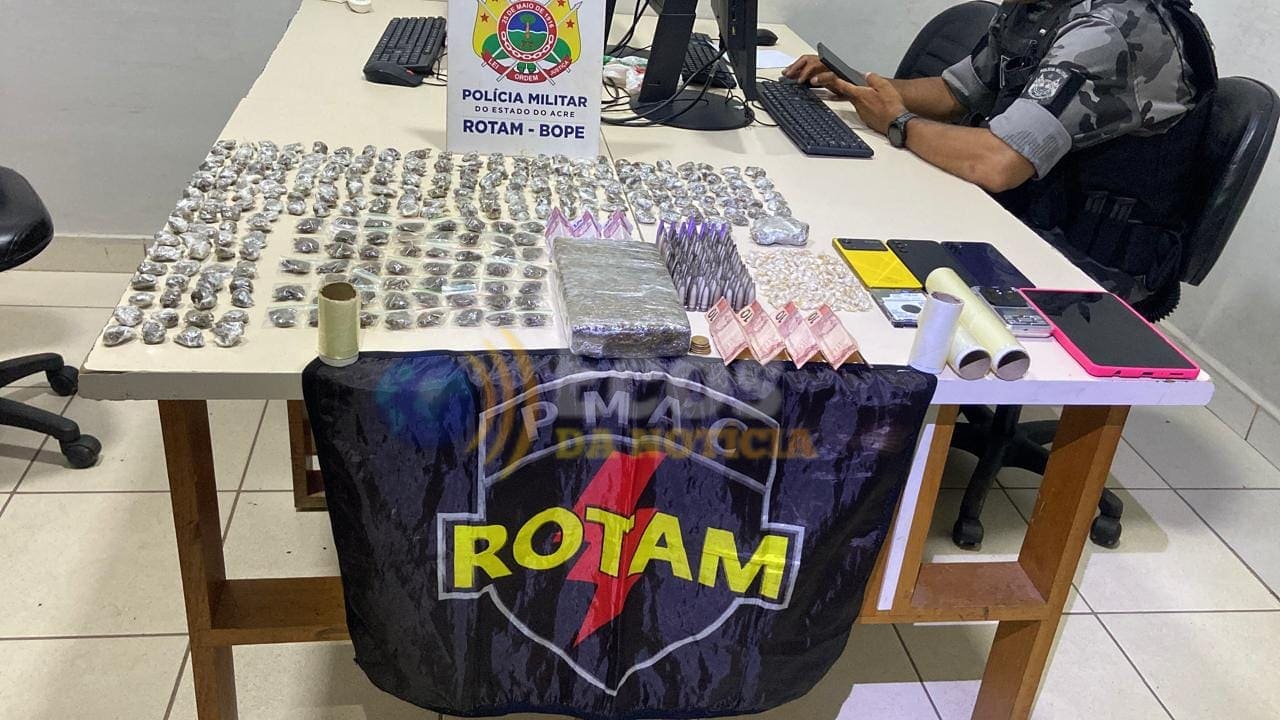 Na varredura realizada no local, a ROTAM apreendeu uma grande quantidade de entorpecentes: 106 pinos de cocaína pura, 54 porções de maconha, um tijolo de maconha pesando 1,030 kg, além de 173 pedras de crack e 231 invólucros de maconha. Também foram recolhidos dinheiro em espécie — cerca de R$ 60 — uma balança de precisão e materiais utilizados para embalar a droga.