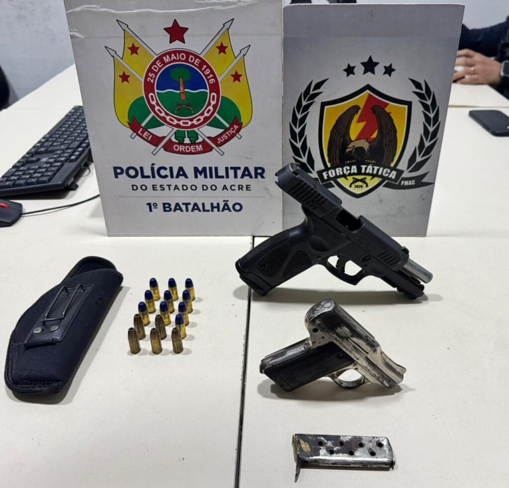 Durante a ação, os policiais avistaram um homem em atitude suspeita, que ao chegar de motocicleta, demonstrou nervosismo e tentou ajustar um volume na cintura. Foi feita a abordagem e, na revista pessoal, os militares localizaram uma pistola Taurus G3 calibre 9mm, municiada com 15 munições intactas — material de uso restrito. No bolso da bermuda do abordado, também foi encontrada uma pistola calibre 6.35, sem numeração aparente.