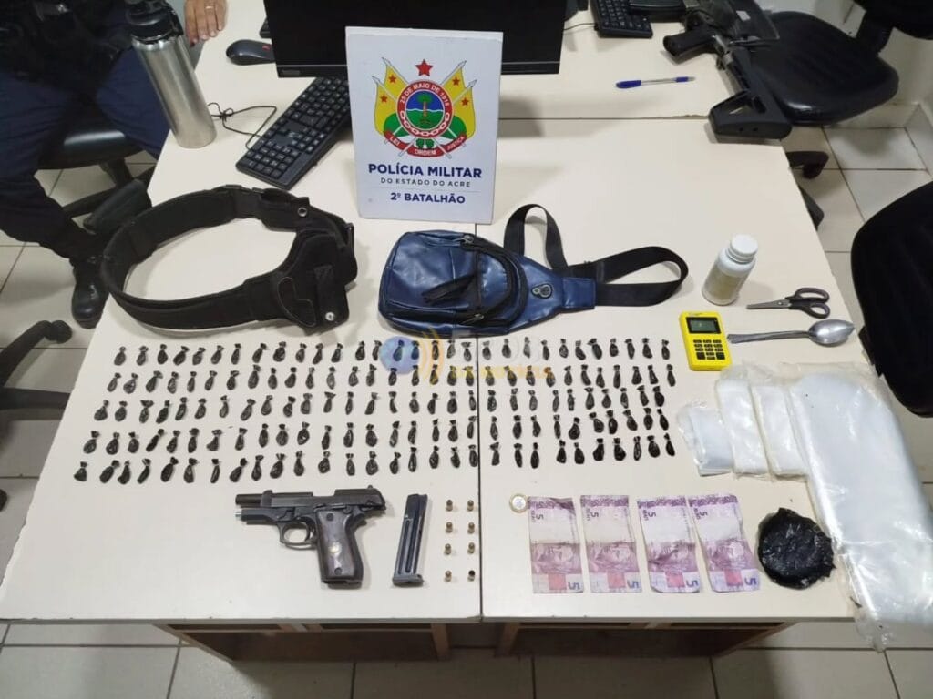Uma ação do 2º Batalhão da Polícia Militar do Acre (PMAC) resultou na prisão de um homem por tráfico de drogas e porte ilegal de arma de fogo na noite deste sábado (22), no bairro Santa Helena, em Rio Branco. A ocorrência aconteceu por volta das 20h30, após diversas denúncias anônimas sobre o funcionamento de uma boca de fumo na região.