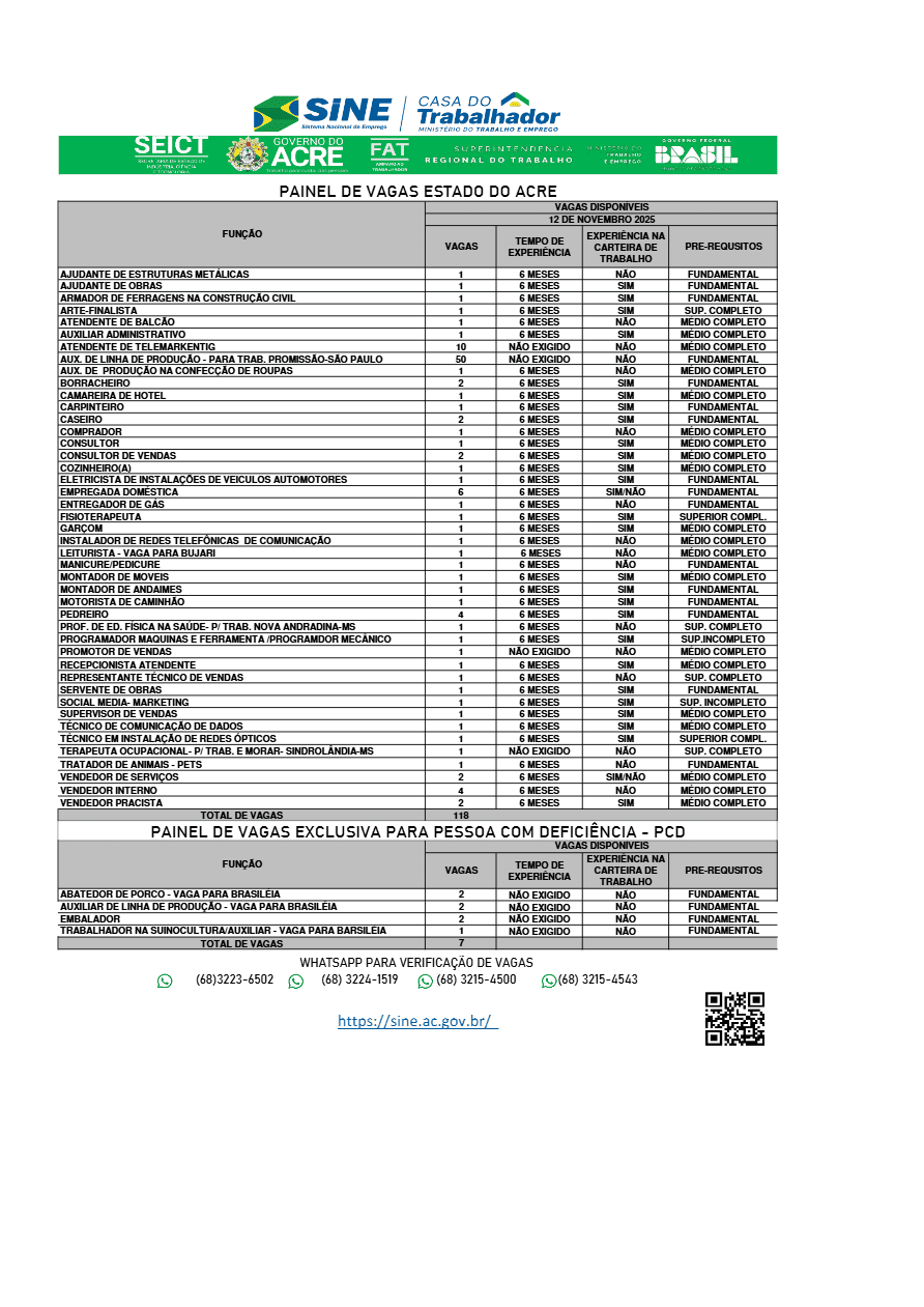 Os interessados podem obter mais informações sobre os critérios de cada vaga e acompanhar as atualizações diretamente na unidade do Sine Acre, ou pelos telefones: (68) 3223-6502, (68) 3224-1519, (68) 3215-4500 e (68) 3215-4543.