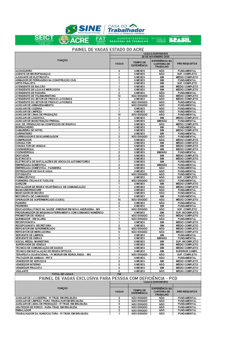 O Sistema Nacional de Emprego (Sine) do Acre divulgou, nesta sexta-feira, 28, um novo painel com 159 vagas de trabalho para diversas áreas profissionais em Rio Branco.