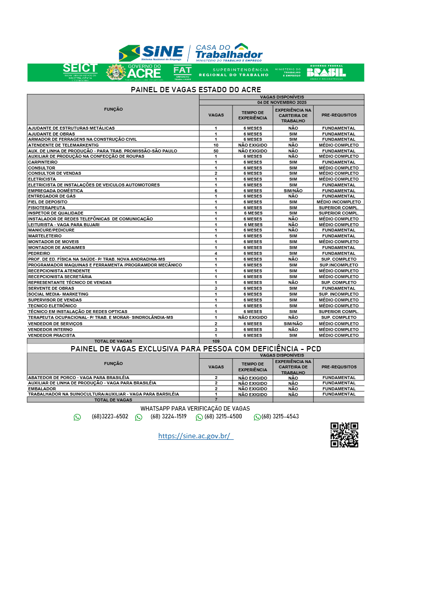 Os interessados podem obter mais informações sobre os critérios de cada vaga e acompanhar as atualizações diretamente no Sine Acre, ou pelos telefones: (68) 3223-6502 | (68) 3224-1519 | (68) 3215-4500 | (68) 3215-4543.