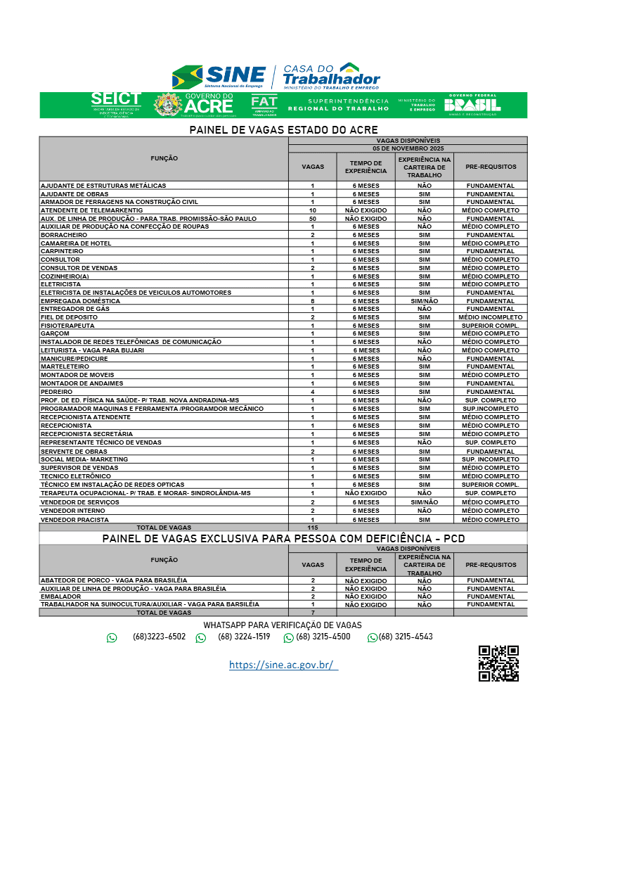 Os interessados podem obter mais informações sobre os critérios de cada vaga e acompanhar as atualizações diretamente no Sine Acre, ou pelos telefones: (68) 3223-6502 | (68) 3224-1519 | (68) 3215-4500 | (68) 3215-4543.