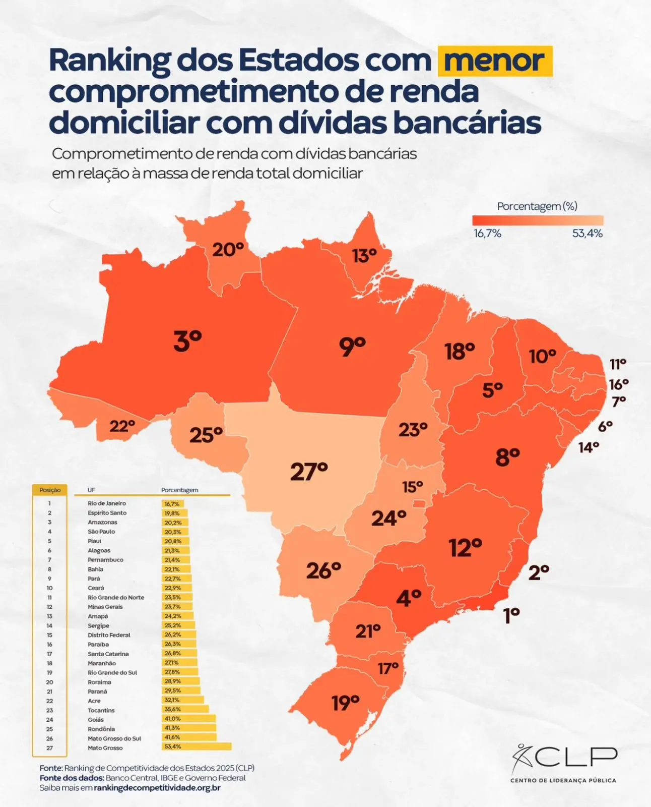 O Acre aparece na 22ª posição no Ranking dos Estados com menor comprometimento de renda domiciliar com dívidas bancárias, com índice de 32,1%. Os dados foram compilados a partir de informações do Banco Central, IBGE e Governo Federal, e integram o Ranking de Competitividade dos Estados, no pilar Potencial de Mercado.