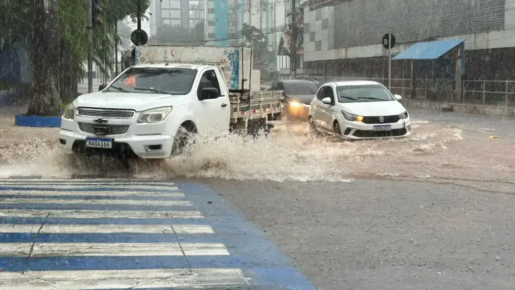 Com a água avançando rapidamente, motoristas reduzem a velocidade e trafegam com cautela. Em alguns trechos, a água já atinge áreas de calçada e pontos de ônibus, evidenciando a rapidez da elevação.