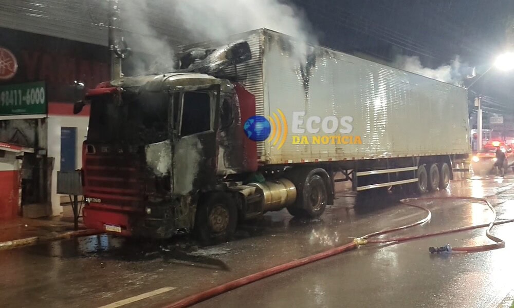 Uma carreta modelo Scania, de cor vermelha, pegou fogo na cabine e em uma parte do baú na noite desta terça-feira (30), após o motorista parar o veículo para atender uma ligação telefônica na Via Chico Mendes, na região da Vila do Denit, no Segundo Distrito de Rio Branco.