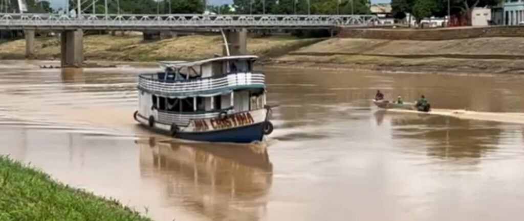 Com o volume do Rio Acre elevado, uma embarcação de grande porte conseguiu chegar a Rio Branco na tarde desta segunda-feira (22). A chegada ocorreu na região conhecida como praia da Base e foi acompanhada pelo ac24horas Play, durante entrevista do repórter David Medeiros com o freteiro Agnelo Araújo Freitas Neto, conhecido como Nenê, responsável pela condução da embarcação Ana Cristina, vinda do município de Pauini, no Amazonas.