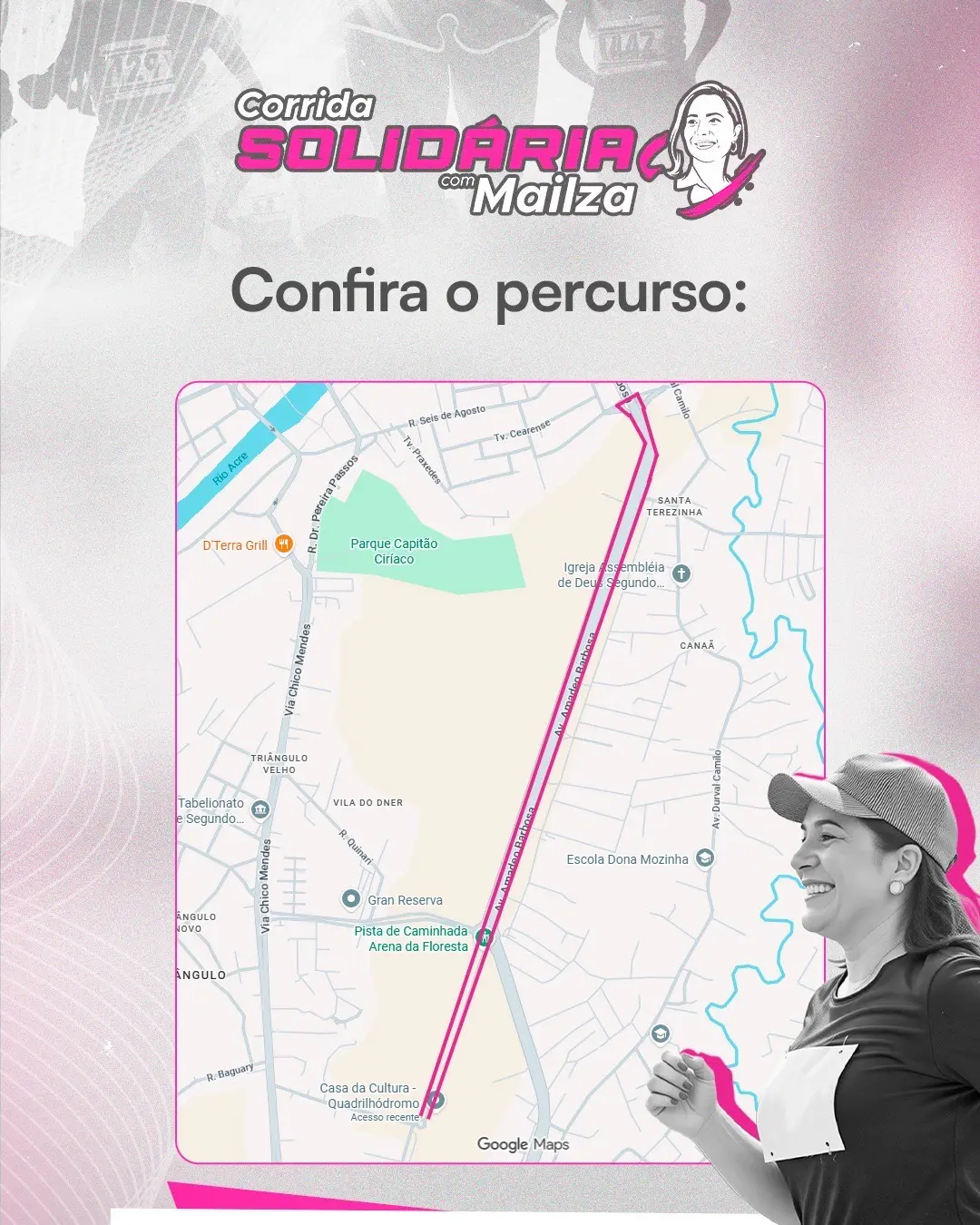 A organização da Corrida Solidária com Mailza divulgou o percurso oficial do evento, que será realizado neste sábado, 13, com concentração às 16h e largada às 17h, no estacionamento da Arena da Floresta, em Rio Branco.