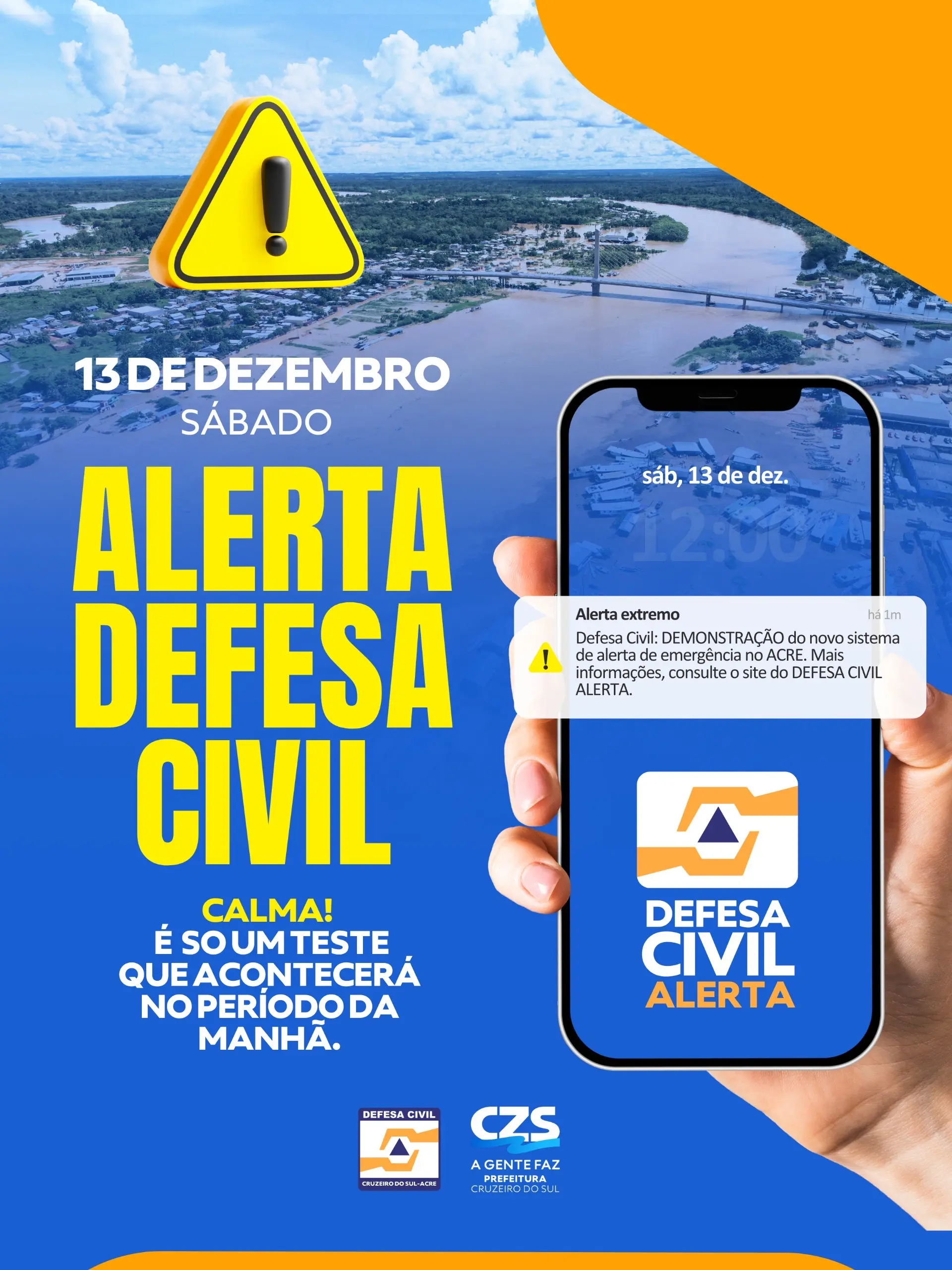 A Defesa Civil Municipal de Cruzeiro do Sul, em parceria com a Defesa Civil Estadual, realizará neste sábado, 13, um teste do Sistema de Alerta de Emergência, que envia notificações diretamente aos celulares da população que vive em áreas de risco de inundação. A ação ocorrerá entre 9h e 12h e tem caráter exclusivamente preventivo.