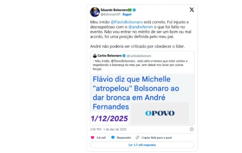 “Foi injusto e desrespeitoso” com André Fernandes, escreveu o deputado Eduardo Bolsonaro (PL-SP), alegando que o apoio a Ciro Gomes, foi uma posição firmada pelo próprio Bolsonaro.
