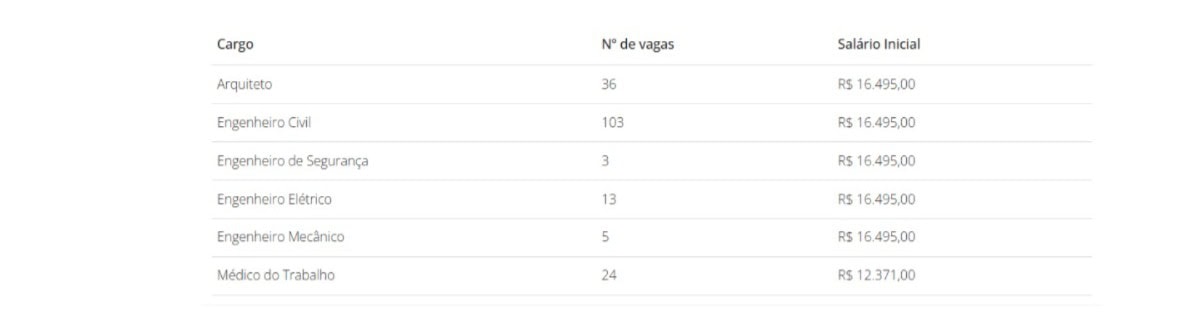Ao todo, são 184 vagas e formação de cadastro de reserva distribuídas entre seis cargos. A maior parte é para engenheiros civis, mas também há oportunidades para arquitetos e médicos do trabalho. Os salários variam de R$ 12.371,00 a R$ 16.495,00.