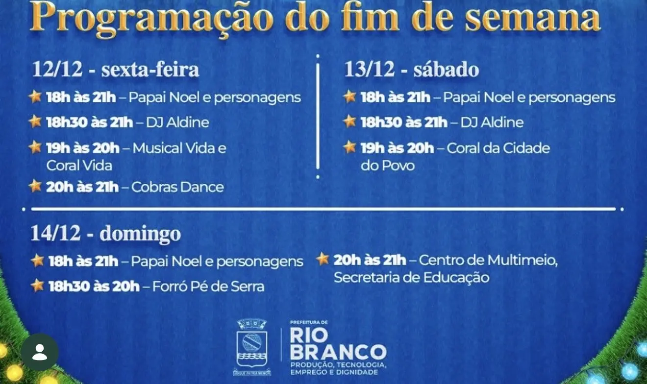 A Prefeitura de Rio Branco segue com a programação do Natal de Vida, Esperança e Dignidade 2025 e, neste domingo (14), promove uma série de atrações gratuitas na Praça da Revolução, voltadas para toda a família.