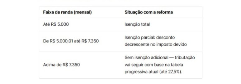 E, embora o projeto amplie a faixa de isenção e crie uma segunda faixa de isenção parcial (detalhada abaixo), a tabela progressiva clássica do Imposto de Renda manterá sua estrutura central, com alíquotas variando de 7,5% a 27,5%.