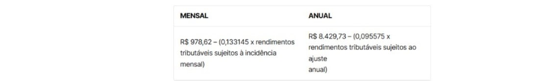 IRRF = R$ 562,63 – [R$ 978,62 – (0,133145 x R$ 6.000,00)]