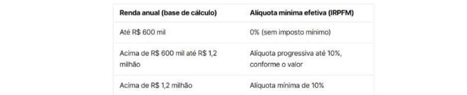 Para compensar a perda de arrecadação, a reforma focou na alta renda, criando o Imposto de Renda das Pessoas Físicas Mínimo (IRPFM), que incidirá sobre rendimentos tributáveis anuais superiores a R$ 600 mil até R$ 1,2 milhão, ou, na prática, para quem ganha acima de R$ 50 mil a R$ 100 mil por mês.