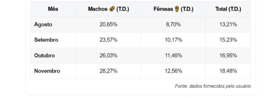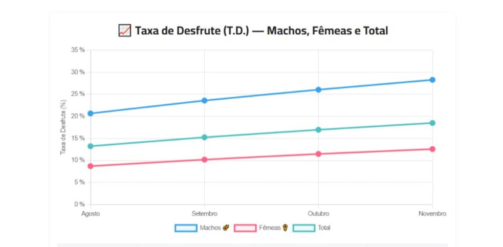 A diferença da taxa de desfrute total de novembro e agosto é de 5,27 pontos percentuais (incluindo machos e fêmeas). Não é uma melhora extraordinária. Mas, ainda assim, é uma melhora importante. Sem contar um fator local: houve melhora, mesmo com todos os problemas que o produtor de carne enfrenta por aqui, com destaque para embargos ambientais ou problemas relacionados à regularização fundiária.