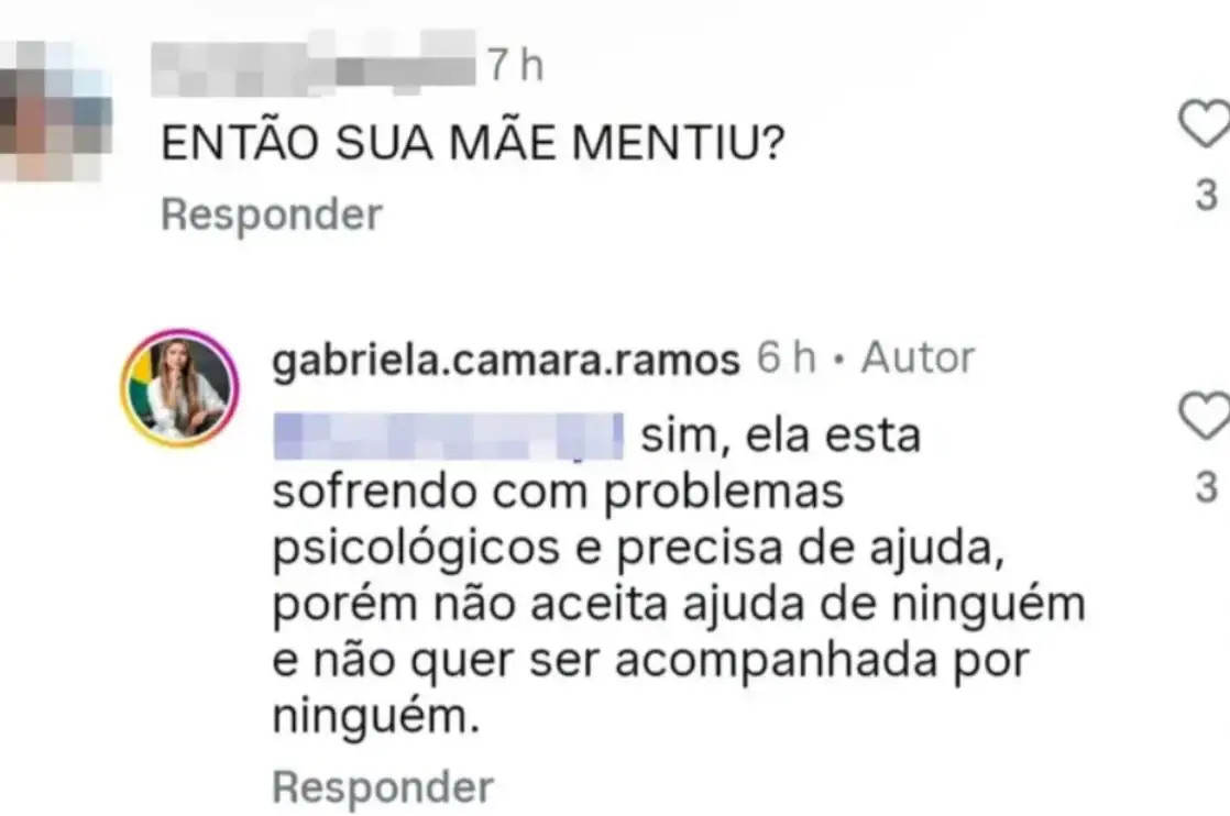 Em um comentário que rapidamente se espalhou, Gabriela revelou: “Ela está sofrendo com problemas psicológicos e precisa de ajuda, porém não aceita ajuda de ninguém e não quer ser acompanhada por ninguém.”