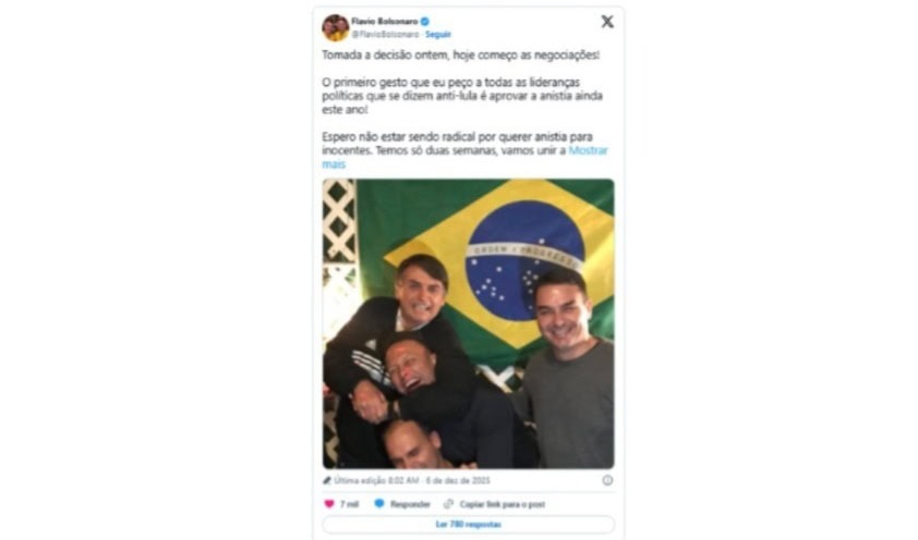 “Espero não estar sendo radical por querer anistia para inocentes. Temos só duas semanas, vamos unir a direita”, concluiu Flávio em sua publicação.