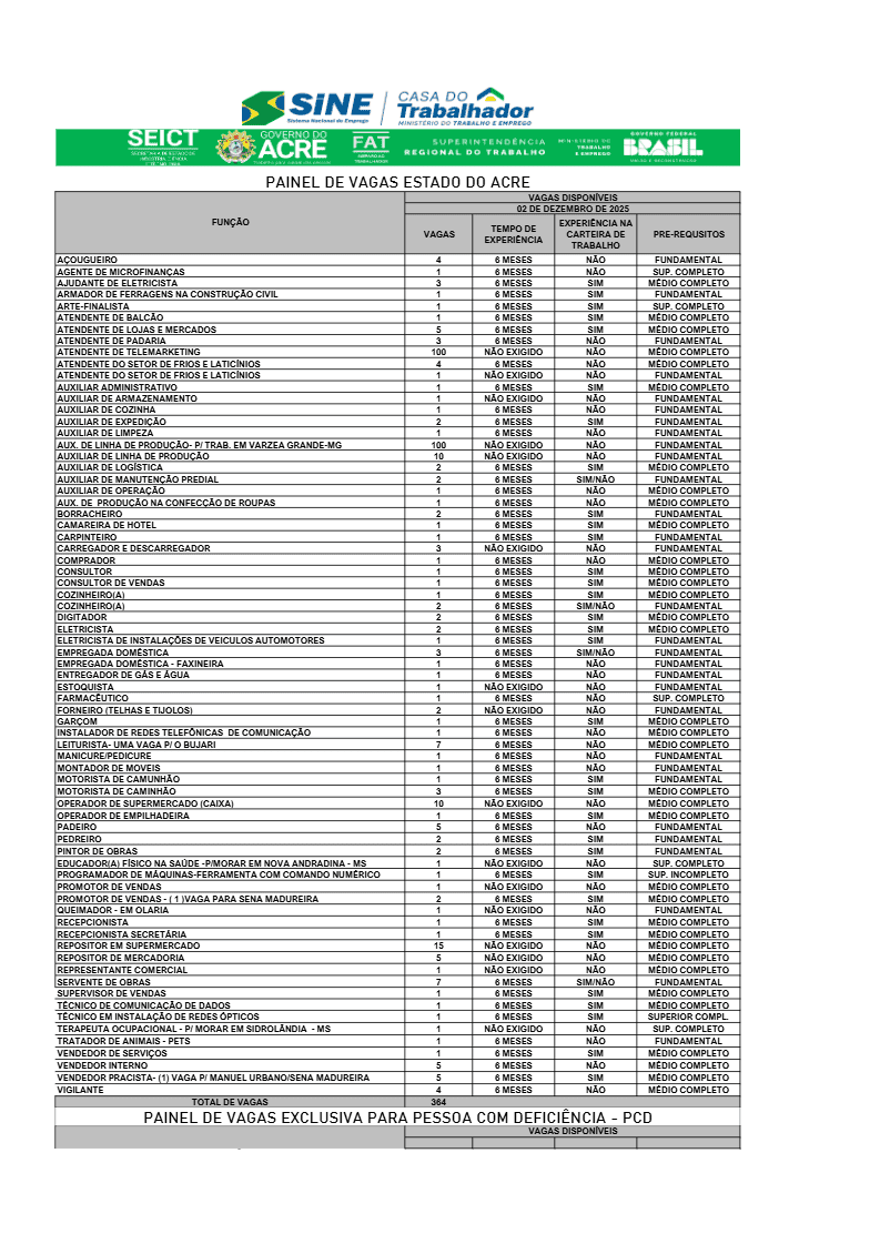 O Sistema Nacional de Emprego (Sine) do Acre divulgou, nesta terça-feira, 2, um novo painel com 387 vagas de trabalho disponíveis para diferentes áreas profissionais em Rio Branco.