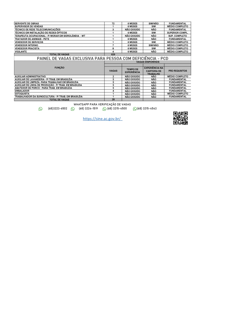 O Sistema Nacional de Emprego do Acre (Sine) disponibiliza 658 vagas de trabalho nesta quinta-feira (18) para candidatos com ensino fundamental e médio, incluindo oportunidades destinadas a pessoas com deficiência (PCDs).