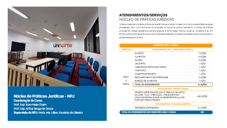 O Núcleo de Práticas Jurídicas (NPJ) e o Projeto Mariri, em parceria com o Tribunal de Justiça do Acre, realizaram 462 atendimentos, abrangendo orientações jurídicas e ações cíveis, incluindo divórcios, alimentos, guarda, usucapião, indenizações por danos morais e acidentes de trânsito.