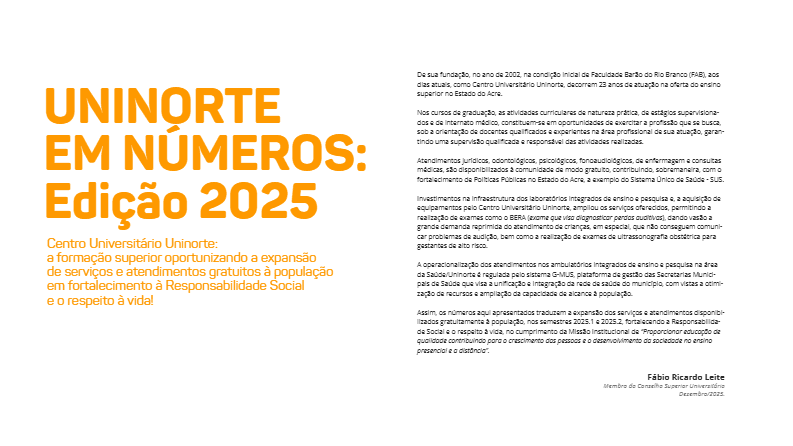 O Centro Universitário Uninorte, presente no Acre desde 2002, lançou o relatório anual “Uninorte em Números – Edição 2025”, detalhando a extensão e a diversidade de atendimentos gratuitos prestados à população ao longo dos semestres 2025.1 e 2025.2. O documento evidencia a relevância social da instituição, que alia ensino superior de qualidade à promoção do bem-estar e da saúde da comunidade.