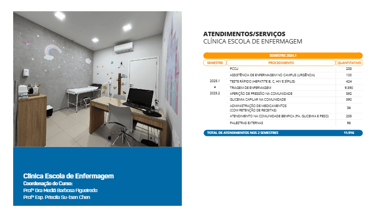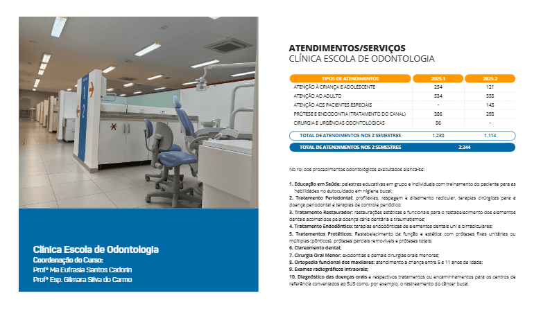 A Clínica Escola de Odontologia contabilizou 2.344 procedimentos, abrangendo atendimento a crianças, adultos e pacientes especiais, além de tratamentos restauradores, endodônticos, próteses, cirurgias orais menores e educação em saúde bucal.