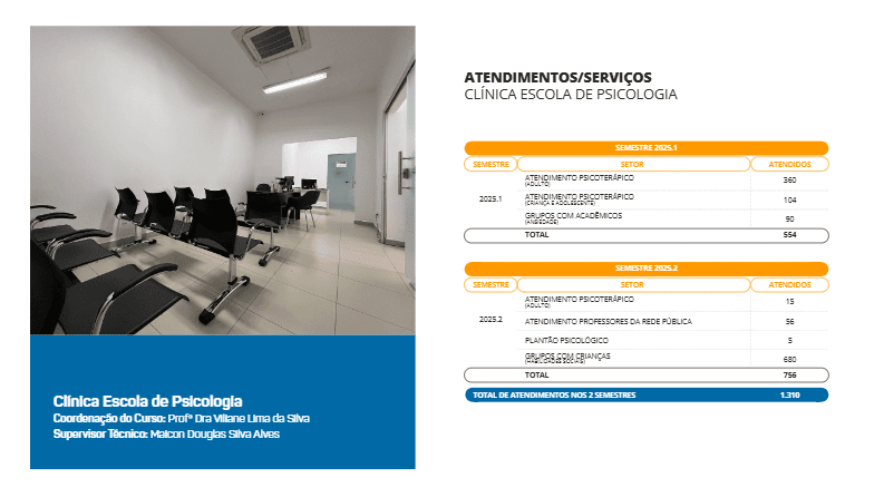 “Os números aqui apresentados traduzem a expansão dos serviços e atendimentos disponibilizados gratuitamente à população, nos semestres 2025.1 e 2025.2, fortalecendo a responsabilidade Social e o respeito à vida, no cumprimento da Missão Institucional de proporcionar educação de qualidade contribuindo para o crescimento das pessoas e o desenvolvimento da sociedade no ensino presencial e a distância”, destacou o Presidente do Conselho Superior Universitário, Fábio Ricardo Leite.