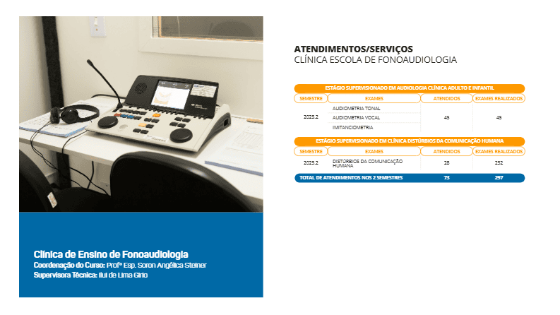 Em Fonoaudiologia, os serviços chegaram a 73 pacientes, com a realização de 297 exames voltados à audição e distúrbios da comunicação humana, incluindo o exame BERA, fundamental para detectar perdas auditivas em crianças que ainda não conseguem comunicar dificuldades na audição.