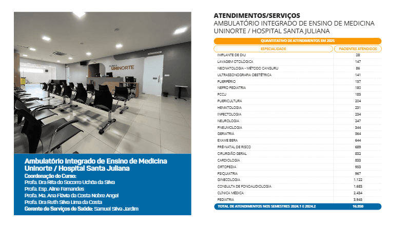 Já o Ambulatório Integrado de Medicina (Bloco F da Instituição), e o Ambulatório de Ensino do Hospital Santa Juliana, juntos, registraram 16.850 atendimentos, abrangendo especialidades como pediatria, clínica médica, ginecologia, cardiologia, ortopedia, psiquiatria, ultrassonografia obstétrica, pré-natal de risco, neonatologia, puericultura e exames de hematologia e infectologia.