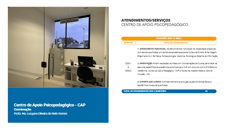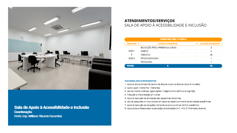 O Centro de Apoio Psicopedagógico realizou 42 atendimentos individuais, enquanto a Sala de Apoio à Acessibilidade e Inclusão atendeu 54 alunos de cinco cursos.