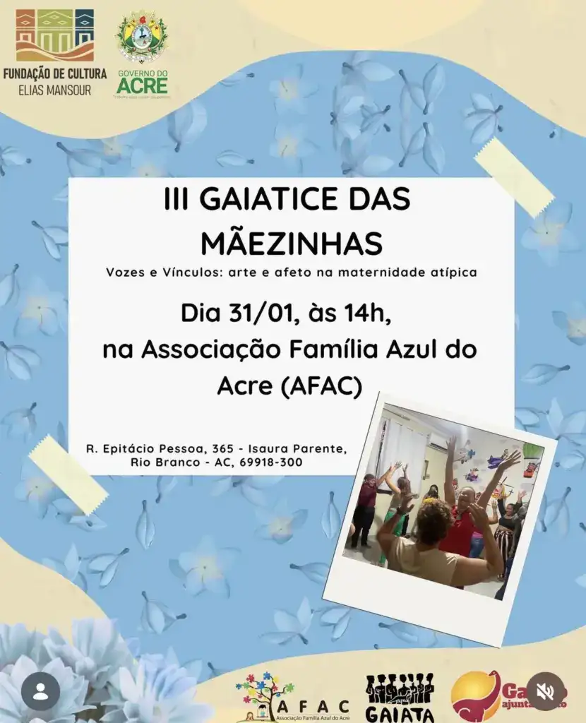 A cidade de Rio Branco recebe, no próximo dia 31 de janeiro, a partir das 14h, a 3ª edição do evento “Gaiatice das Mãezinhas”, que acontece na sede da Associação Família Azul do Acre (AFAC). Com o tema “Vozes e Vínculos”, o encontro propõe um espaço de convivência, troca de experiências e fortalecimento de laços entre mães e responsáveis por crianças autistas.