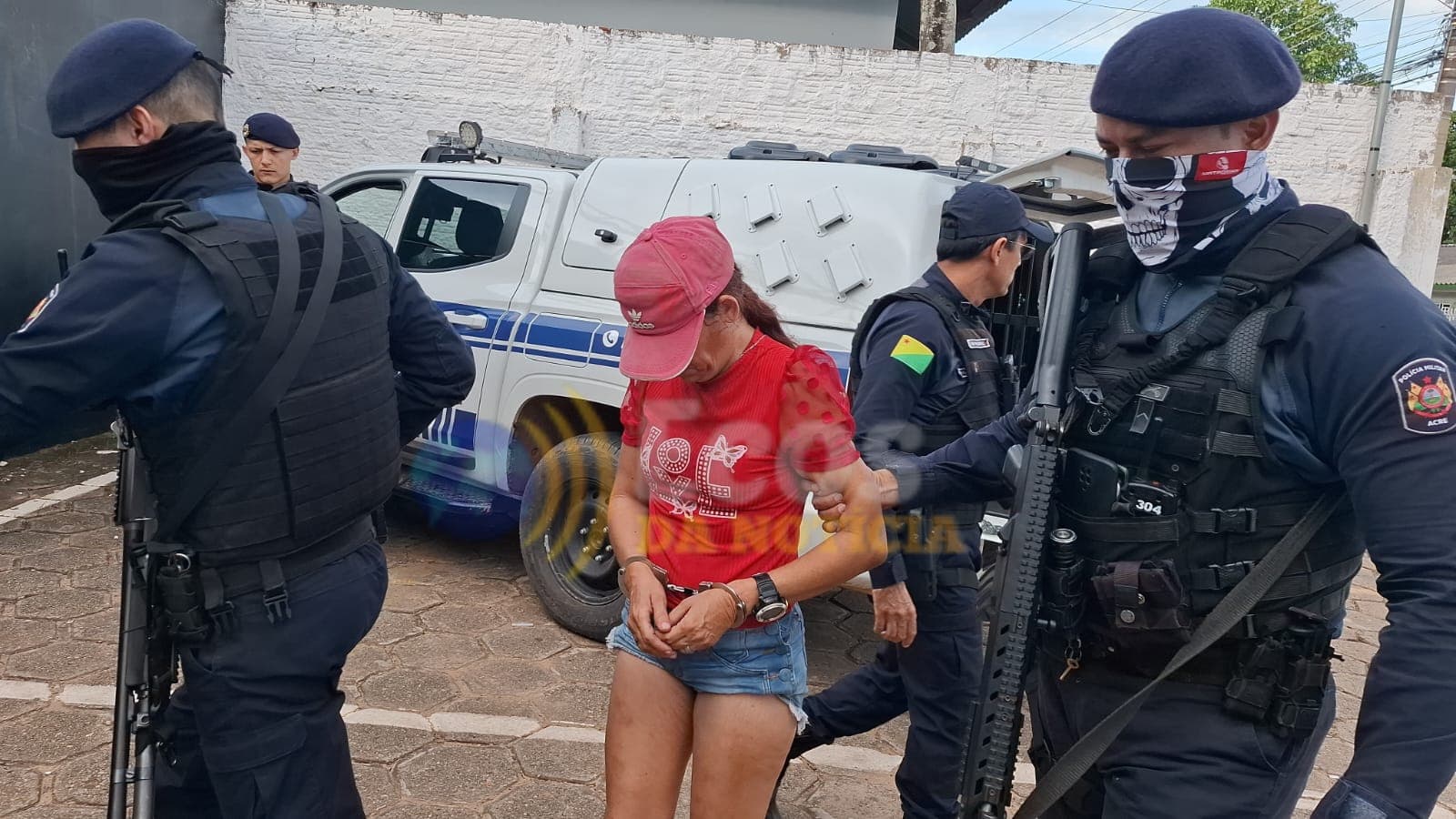 Com base nas características repassadas e no levantamento de informações, os suspeitos foram localizados no bairro Wanderley Dantas. As equipes policiais realizaram acompanhamento e conseguiram efetuar a abordagem em frente a um supermercado situado na Estrada Jarbas Passarinho, no bairro Placas.