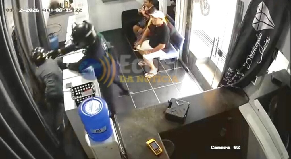 Segundo informações iniciais, dois indivíduos entraram no estabelecimento usando capacetes, possivelmente para dificultar a identificação. Imagens do circuito interno de segurança mostram o momento em que um dos suspeitos coloca uma maleta sobre o balcão, saca um revólver prateado e anuncia o assalto. Na sequência, o comparsa pula o balcão, abre uma cortina interna e rende os funcionários.