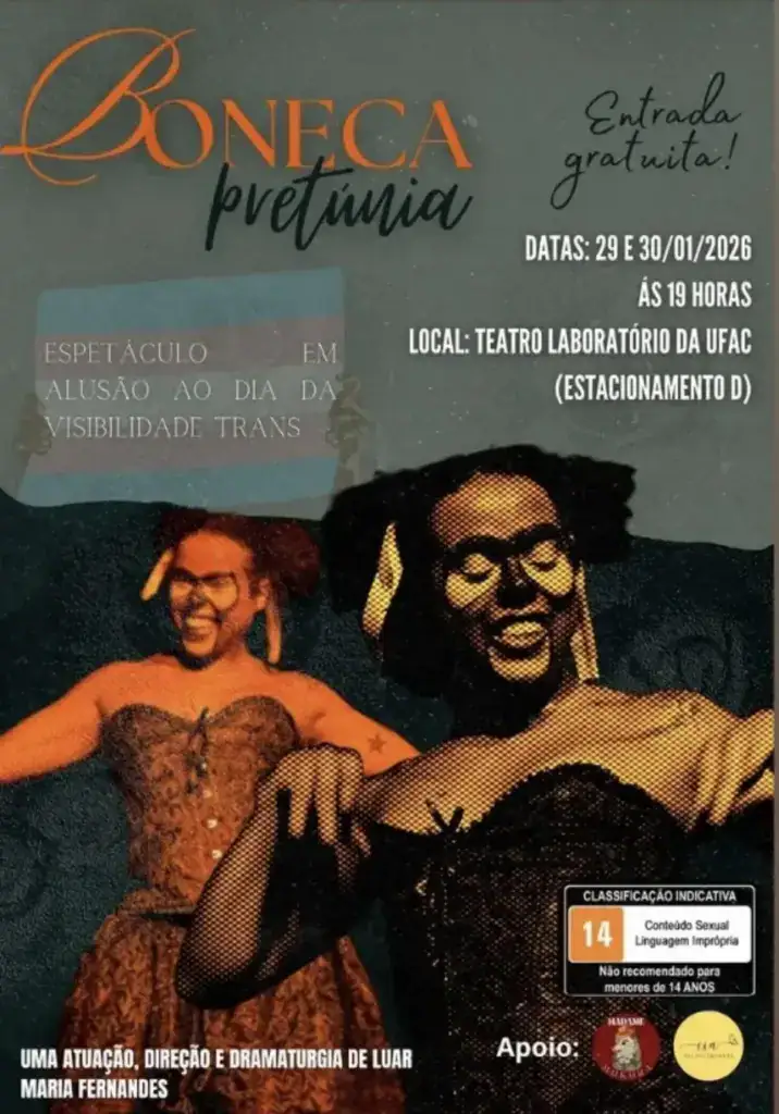 O espetáculo teatral “Boneca Pretúnia” retorna a Rio Branco para duas apresentações especiais nos dias 29 e 30 de janeiro, às 19h, no Teatro Laboratório da Universidade Federal do Acre (UFAC), localizado no Estacionamento D do campus. A entrada é gratuita.