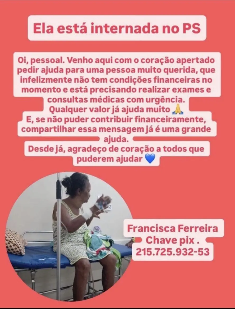 Familiares e amigos estão mobilizados em uma campanha solidária para ajudar Francisca Ferreira, que se encontra internada no Pronto-Socorro e necessita realizar exames e consultas médicas com urgência. Segundo o apelo divulgado nas redes sociais, a paciente enfrenta dificuldades financeiras e, no momento, não possui condições de arcar com os custos do tratamento necessário.