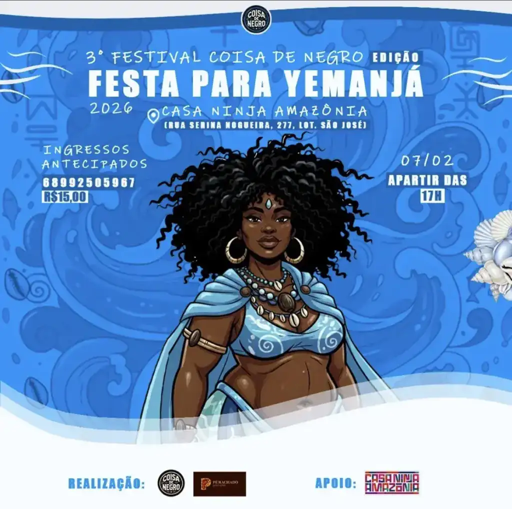 A 3ª edição do Festival Coisa de Negro já tem data, local e um chamado claro: celebrar, ocupar e resistir por meio da cultura. Com o tema “Festa pra Yemanjá”, o evento acontece no dia 07 de fevereiro, na Casa Ninja Amazônia, localizada na Rua Senira Nogueira, nº 277, no Loteamento São José.
