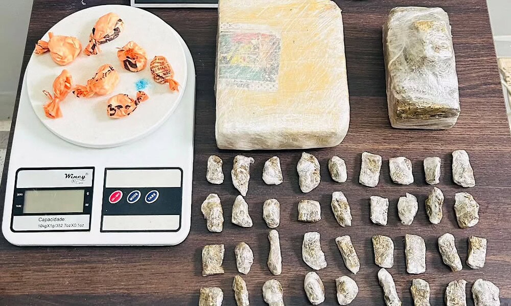 No local, foram apreendidos aproximadamente 758 gramas de uma substância com características semelhantes à maconha, além de sete trouxinhas de uma substância esbranquiçada aparentando ser cocaína.
